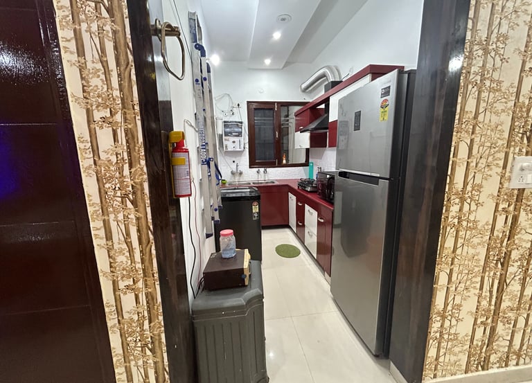 ๐ณ Fully equipped modular kitchen (utensils, 4-burner gas stove, chimney, microwave, mixer)